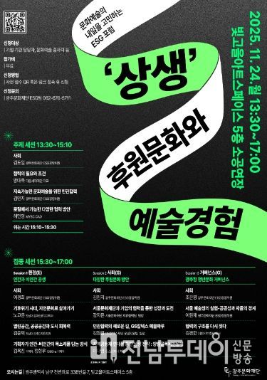 전남투데이 정홍균 기자 | 광주문화재단은 오는 24일 오후 1시 30분, 광주 남구 빛고을아트스페이스 소공연장에서 ‘문화예술의 내일을 고민하는 ESG 포럼’을 개최한다. 이번 포럼은 ‘상생’이라는 대주제 아래, ‘후원문화와 예술경험’을 키워드로 문화예술 분야의 지속가능한 협력 구조와 후원문화 확산 방안을 논의하기 위해 마련됐다.