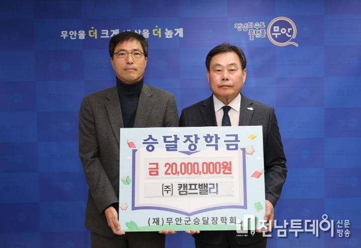 전남투데이 김길룡 기자 | 전남 무안군은 지난 20일 주식회사 캠프밸리에서 지역 인재 육성을 위해 (재)무안군승달장학회에 장학금 2천만 원을 기탁했다고 밝혔다.
