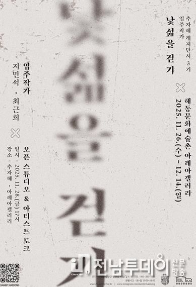 전남투데이 김길룡 기자 | 담양군문화재단은 추자혜 레지던시 3기 입주작가 결과발표전시 '낯섦을 걷기'가 오는 11월 26일부터 12월 14일까지 19일간 해동문화예술촌 아레아갤러리에서 열린다고 밝혔다.