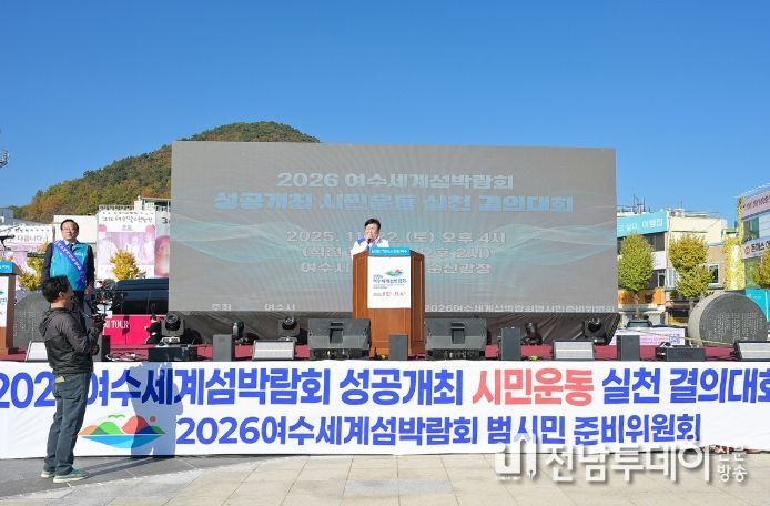 전남투데이 조평훈 기자 | 여수시는 2026여수세계섬박람회 범시민준비위원회(위원장 안규철)가 지난 22일 이순신광장 일원에서 ‘2026여수세계섬박람회 성공개최 시민운동 실천 결의대회’를 개최했다고 밝혔다.