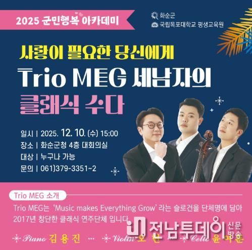 조미화 화순군 인구청년정책과장은 “2025년 한 해 동안 군민행복 아카데미에 함께해 주신 군민 여러분께 감사드린다”라며, “Trio MEG가 들려주는 따뜻한 음악과 이야기로 연말의 감동과 위로를 느끼시길 바란다”라고 말했다.