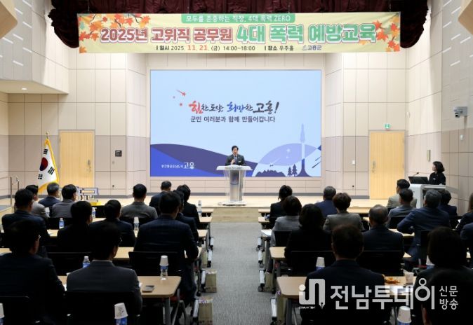전남투데이 조평훈 기자 | 고흥군은 지난 21일 군청 우주홀에서 5급 이상 고위직 공무원 49명을 대상으로 4대 폭력(성희롱·성폭력·성매매·가정폭력) 예방교육을 실시했다고 밝혔다.