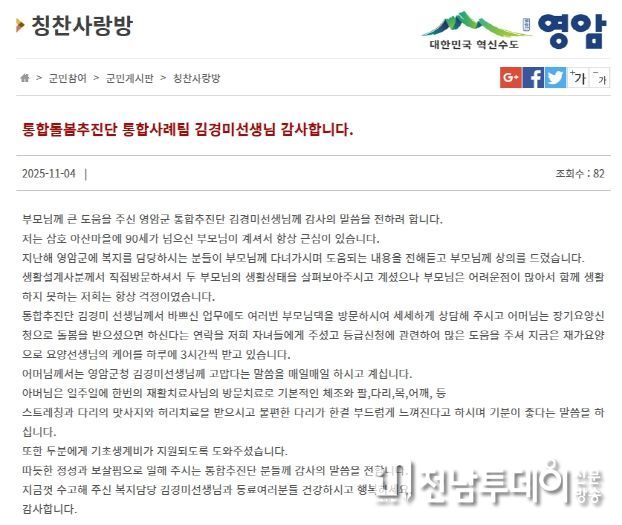 이달 4일 어르신의 딸은 영암군홈페이지 ‘칭찬사랑방’에 글을 올려 영암군의 사례관리와 통합사례관리사의 배려에 고마움을 전했다.