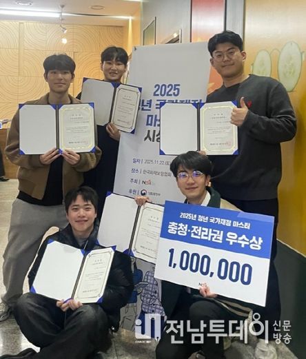 전남대학교(총장 이근배)는 지난 11월 22일 서울 여의도 한국화재보험협회에서 열린 ‘2025 청년 국가재정 마스터’ 최종 보고대회 및 시상식에서 행정학과 곽세민·김태윤·최건우·최문혁 학생과 자율전공학부 이정훈 학생이 충청·전라·제주 권역 우수상을 수상했다고 26일 밝혔다.