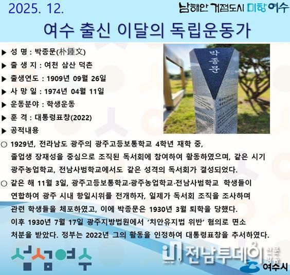 전남투데이 조평훈 기자 | 여수시는 2025년 12월의 독립운동가로 전라남도 여천 삼산 덕촌 출신의 ‘박종문(朴鍾文)’ 선생을 선정했다.