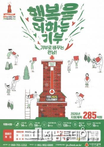 전남투데이 조평훈 기자 | 순천시는 전남사회복지공동모금회와 함께 오는 12월 1일부터 2026년 1월 31일까지 62일간 ‘희망2026나눔캠페인’을 실시한다고 밝혔다.