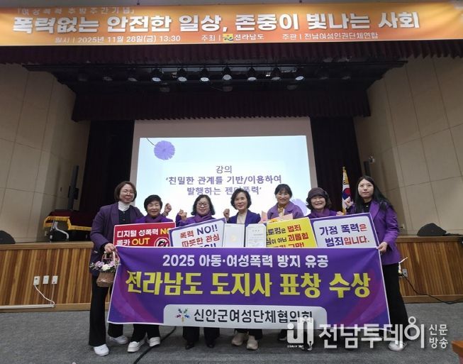 전남투데이 김길룡 기자 | 신안군여성단체협의회(회장 안미영)가 11월 28일 전남여성가족재단에서 개최된 ‘2025년 여성폭력추방주간 기념행사’에서 여성폭력 방지 유공을 인정받아 전남도지사 표창을 수상하는 영예를 안았다.