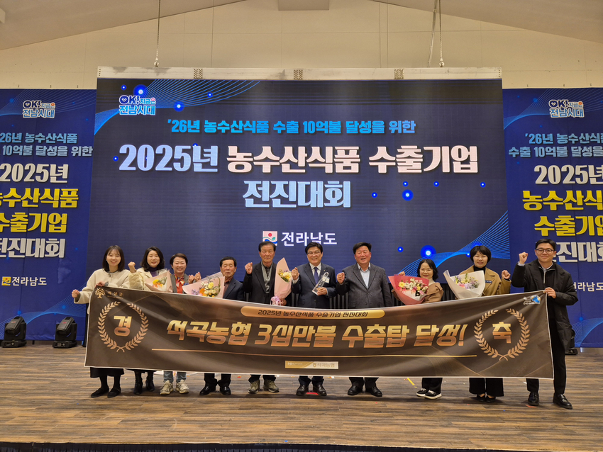 전남투데이 정홍균 기자 | 석곡농협(조합장 한승준)은 지난 28일 무안군 스카이웨딩컨벤션에서 개최된 2025년 농수산식품 수출기업 전진대회에서 ‘3십만불 수출탑’을 수상했다고 밝혔다.