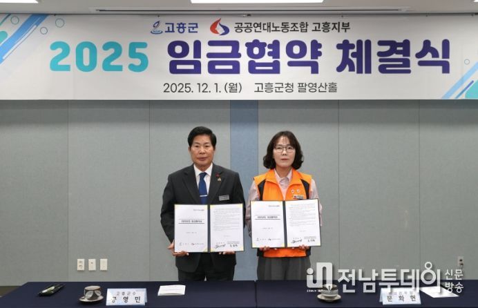 전남투데이 조평훈 기자 | 고흥군은 지난 1일 공무직 근로자의 처우 개선과 안정적인 노사관계 구축을 위해 공공연대노동조합 고흥지부와 2025년도 임금협약을 체결했다고 밝혔다.