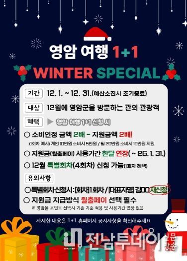 전남투데이 박상훈 기자 | 영암군이 연말 지역 관광 수요 견인을 위해 12월 한 달 동안 ‘영암에서 즐기는 설산가산 이벤트’로 ‘영암여행 1+1’ 혜택을 대폭 늘린다.