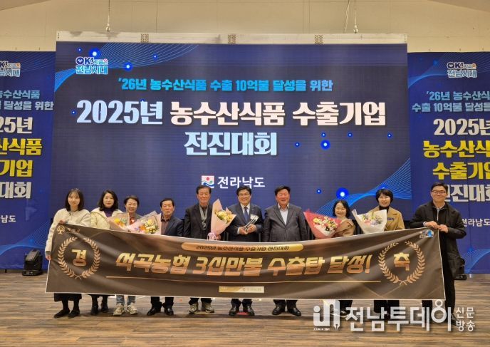 전남투데이 정홍균 기자 | 전남 곡성군은 지난 11월 28일 남악 스카이웨딩컨벤션에서 열린‘2025년 농수산식품 수출기업 전진대회’에서 관내 소재한 석곡농업협동조합이 30만 불 수출탑을 수상했다고 2일 밝혔다.
