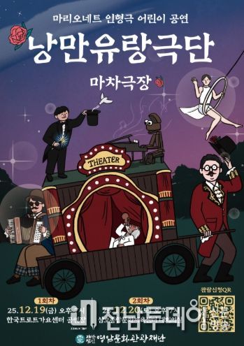 전남투데이 박상훈 기자 | (재)영암문화관광재단은 연말을 맞아 영암군 어린이와 가족을 위한 마리오네트 인형극 어린이 공연 '낭만유랑극단:마차극장'을 오는 12월 19일 오후 7시에 한국트로트가요센터 공연장과 12월 20일(토) 오후 7시에 삼호종합문화체육센터 대회의실에서 개최한다.