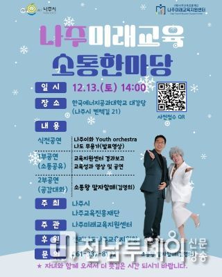 전남투데이 김윤걸 기자 | 전라남도 나주시가 미래 교육 성과를 시민과 공유하는 ‘나주미래교육소통한마당’을 오는 12월 13일 한국에너지공과대학교 대강당에서 개최한다.