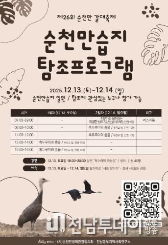 전남투데이 조평훈 기자 | 순천시는 오는 13일부터 14일까지 순천만습지 일원에서 ‘제26회 순천만 갈대축제_겨울철새 탐조 특별판’을 개최한다고 밝혔다.
