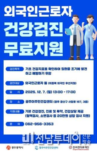 전남투데이 김경민 기자 | 광주광역시는 오는 7일 오후 1시부터 5시까지 광주이주민건강센터에서 외국인근로자 등을 대상으로 무료 건강검진을 실시한다.