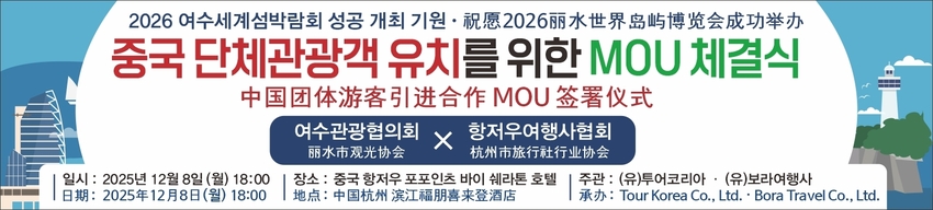 행사를 주관한 (유)투어코리아·(유)보라여행사(대표 이방실)는 “2026 여수세계섬박람회는 아시아를 대표하는 섬·해양 국제행사로, 중국 관광객 유치의 매우 중요한 기회”라며 “이번 협력 체결을 통해 여수와 순천의 지역관광 산업이 한 단계 도약하는 계기가 되길 기대한다”고 밝혔다.