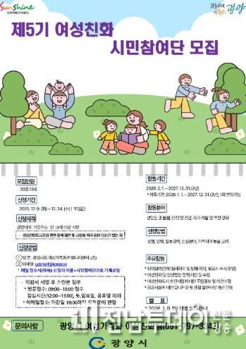 전남투데이 조평훈 기자 | 광양시는 여성친화도시 조성에 시민의 목소리를 적극 반영하기 위해 제5기 여성 친화 시민참여단을 모집한다고 밝혔다.