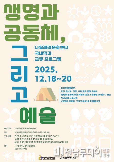 나주문화재단은 오는 12월 18일부터 20일까지 3일간 나빌레라문화센터에서 ‘생명과 평화’를 주제로 한 작가교류 프로그램을 개최한다고 17일 밝혔다.