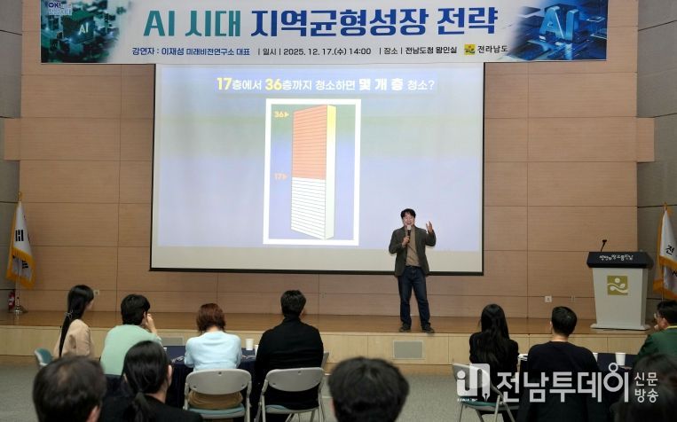 전남투데이 김용희 기자 | 전라남도는 17일 도청 왕인실에서 이재성 미래비전연구소 대표를 초청해 ‘AI 시대 지역균형성장 전략’을 주제로 강연을 개최했다.