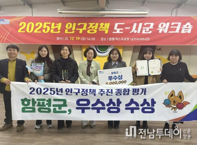 함평군은 전남도가 지난 19일 함평엑스포공원 금호아시아나관에서 개최한 ‘2025년 인구정책 종합평가’에서 우수상을 수상했다고 22일 밝혔다.