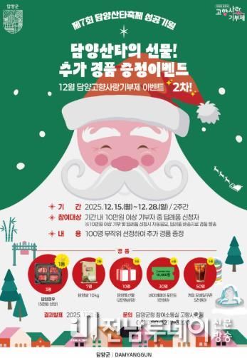 먼저 오는 28일까지 10만 원 이상 기부자 중 100명을 무작위 추첨해 담양한우, 쌀 등 지역 특산품을 증정하는 ‘담양산타의 선물 이벤트’가 진행된다.