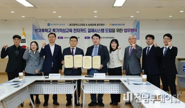 전남투데이 김경민 기자 | 광주시교육청은 23일 시교육청 특수교육지원센터에서 NH농협은행 광주본부와 ‘특수교육대상학생 방과후 특기·적성지원 전자카드 결제시스템 도입을 위한 업무협약’을 체결했다.