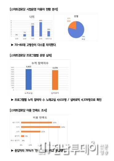 이용자 설문조사 결과에서도 긍정적인 반응이 이어졌다. 응답자의 96%가 사업 운영에 대해 긍정적(만족 이상 75%, 보통 21%)이라고 답했으며, 79%는 이후에도 계속 이용하겠다는 의사를 밝혔다. 이를 통해 사업의 지속 필요성이 확인됐고, 참여자 대부분이 70~80대 고령층으로 스마트경로당이 디지털 취약계층을 대상으로 효과적으로 운영된 것으로 분석됐다.