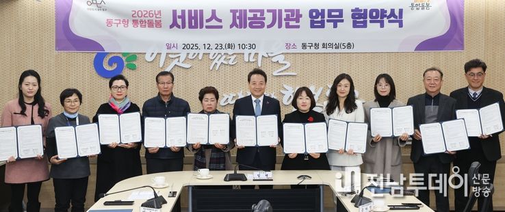 전남투데이 김경민 기자 | 광주 동구는 지난 23일 구청에서 동구지역자활센터 등 11개 서비스 제공기관과 업무협약을 체결하고, 2026년 ‘동구형 통합돌봄’ 사업을 본격 추진한다고 밝혔다.