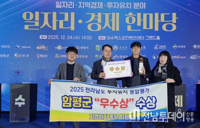 함평군은 지난 24일 전남도 주관 ‘2025년 전라남도 투자 유치 종합평가’에서 우수상을 수상했다고 25일 밝혔다.