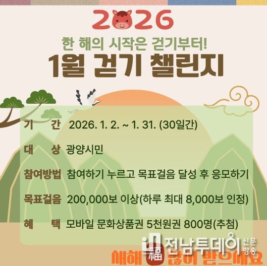 전남투데이 조평훈 기자 | 광양시는 지역 주민의 건강생활실천을 지원하기 위해 모바일 걷기 앱 '워크온'에서 ‘한 해의 시작은 걷기부터! 1월 걷기 챌린지’를 운영한다고 밝혔다.