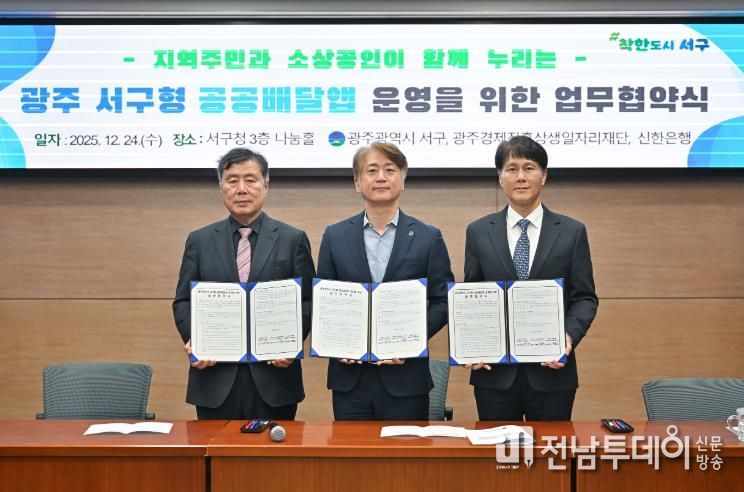 서구는 광주경제진흥상생일자리재단, ㈜신한은행 땡겨요 사업단과 ‘서구형 공공배달앱 운영을 위한 업무협약’을 체결하고, 온라인 배달 소비 영역까지 골목경제 회복 정책을 확대한다고 밝혔다.