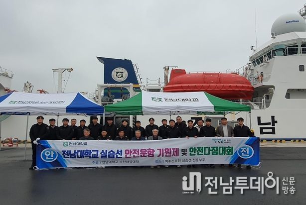 전남투데이 김용희 기자 | 전남대학교 수산해양대학(학장 서호영)은 지난 24일 여수 신북항에서 선박실습센터 및 실습선 교직원들이 참석한 가운데, 실습선의 안전 운항과 승선자의 무사 안녕을 다짐하는 ‘전남대학교 실습선 안전기원제 및 안전 다짐 대회’를 개최했다.