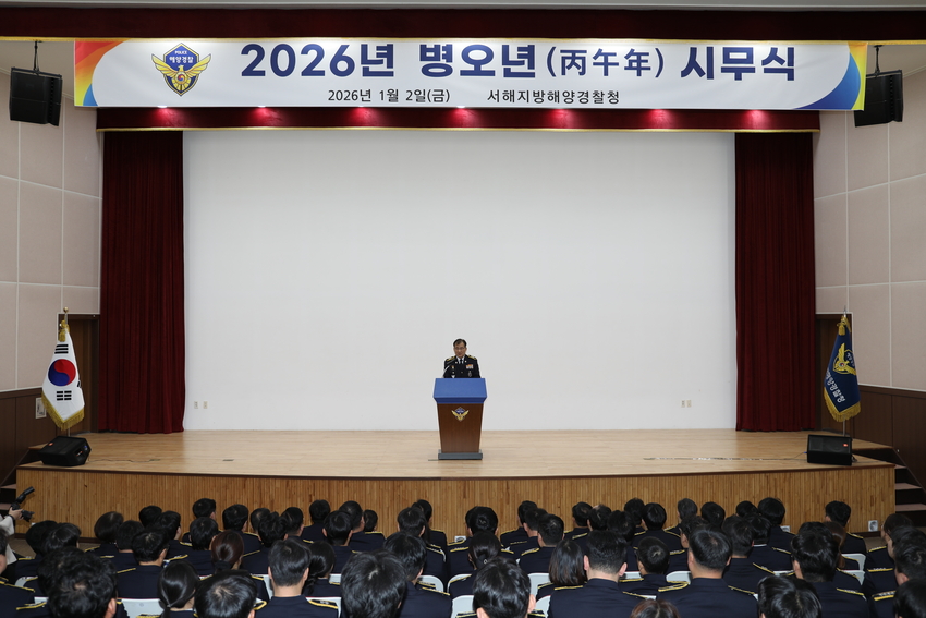 전남투데이 이현승 기자 | 서해지방해양경찰청(청장 백학선)은 2일, 청사 대강당에서 전 직원이 참석한 가운데 2026년 병오년(丙午年)을 맞아 시무식을 개최하고 새해 공식 업무를 시작했다.