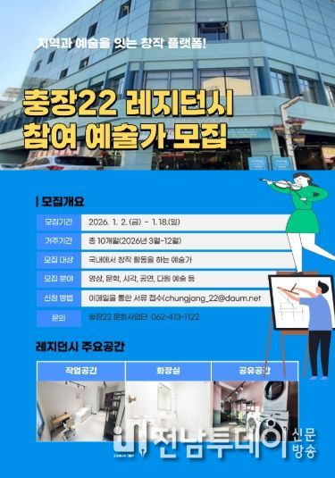 모집 기간은 오는 18일까지이며, 지원 자격은 국내에서 활동 중인 예술가로, 영상·문학·시각·공연·다원 예술 등 분야에 제한을 두지 않는다. 세부 일정과 신청 방법은 충장22 누리집에서 확인할 수 있다.