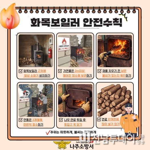 신향식 나주서장은 “화목보일러는 겨울철 따뜻함과 편리함을 제공하는 난방기기이지만 작은 부주의가 큰 화재로 이어질 수 있다”며“철저한 관리와 안전수칙 준수를 통해 안전한 겨울을 보내시길 바란다”고 말했다.