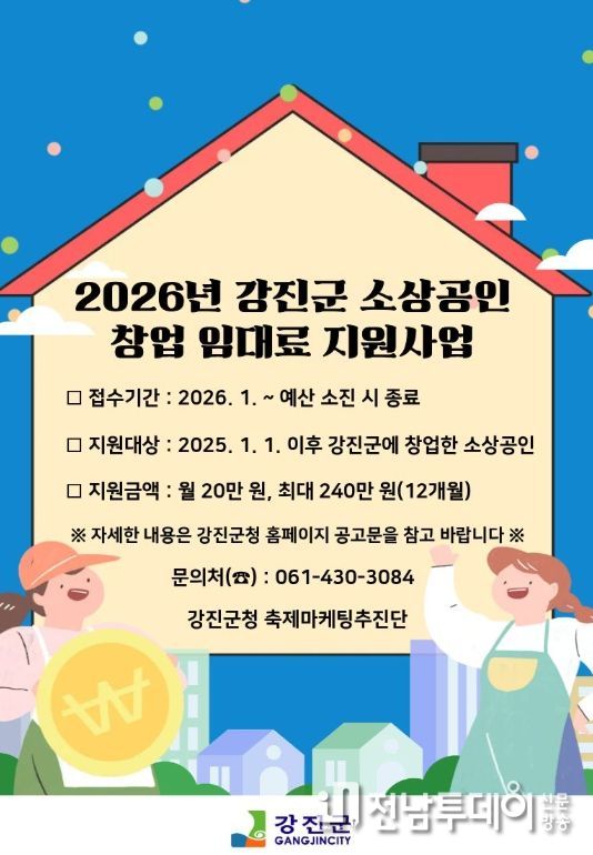 전남투데이 박동운 기자 | 강진군이 창업 초기 소상공인의 경제적 부담을 덜고 안정적인 경영 기반을 마련하기 위해 '2026년 소상공인 창업 임대료 지원사업'을 본격 추진한다.