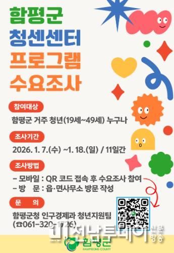 전남투데이 김길룡 기자 | 전남 함평군이 청년들의 실질적인 수요를 반영한 청년센터 프로그램 운영을 위해 사전 수요조사에 나선다.