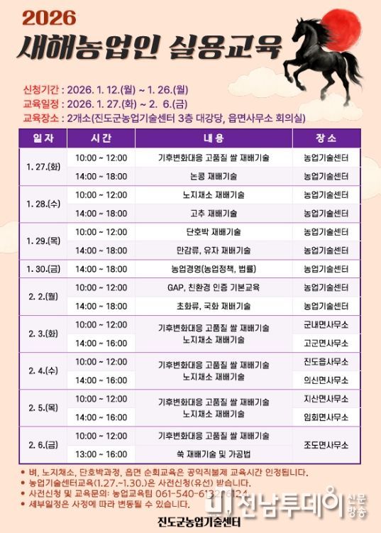 진도군은 ‘2026년도 새해 농업인 실용교육’을 오는 1월 27일부터 2월 6일까지 2주 동안 진도군농업기술센터 등에서 진행한다.