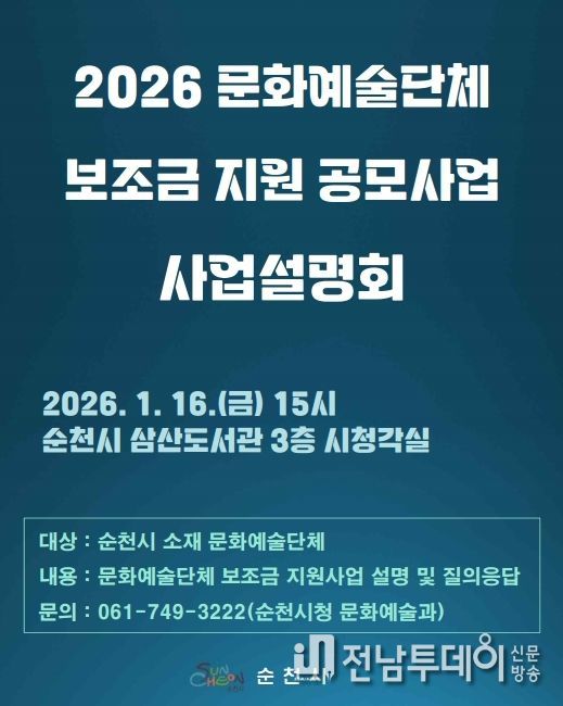 전남투데이 조평훈 기자 | 순천시는 오는 16일 오후 3시, 삼산도서관 3층 시청각실에서 순천시 문화예술단체를 대상으로 ‘2026년 순천시 문화예술단체 보조금 지원사업 설명회’를 개최한다고 밝혔다.