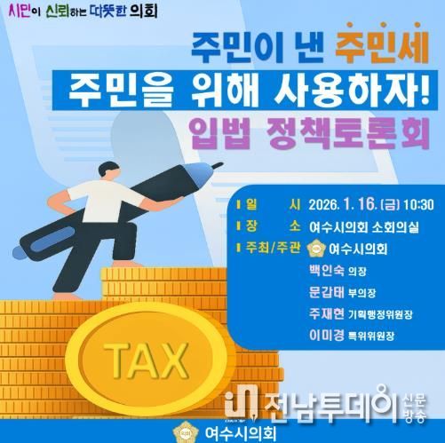 전남투데이 조평훈 기자 | 여수시의회는 오는 1월 16일 오전 10시 30분, 여수시의회 소회의실에서 '주민이 낸 주민세, 주민을 위해 사용하자' 입법 정책토론회를 개최한다.