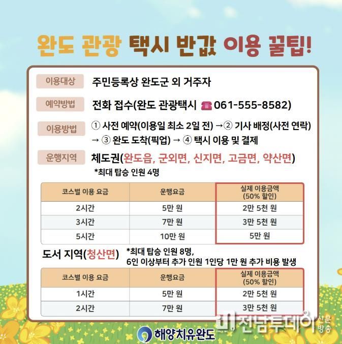 군 관계자는 “반값 관광 택시를 통해 이동의 불편함을 줄이고, 매력 있는 완도 관광지를 두루두루 둘러보시길 바란다”라고 말했다.
