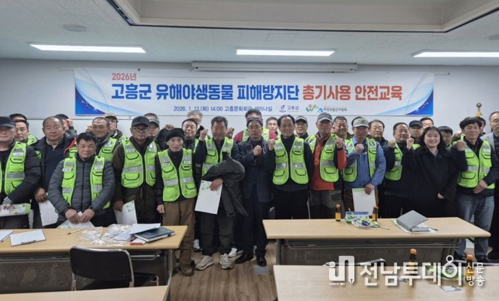 전남투데이 조평훈 기자 | 고흥군은 지난 13일 고흥문화회관 세미나실에서 2026년도 유해야생동물 피해방지단으로 선발된 수렵인 37명을 대상으로 ‘총기 사용 안전교육’을 실시했다고 밝혔다.