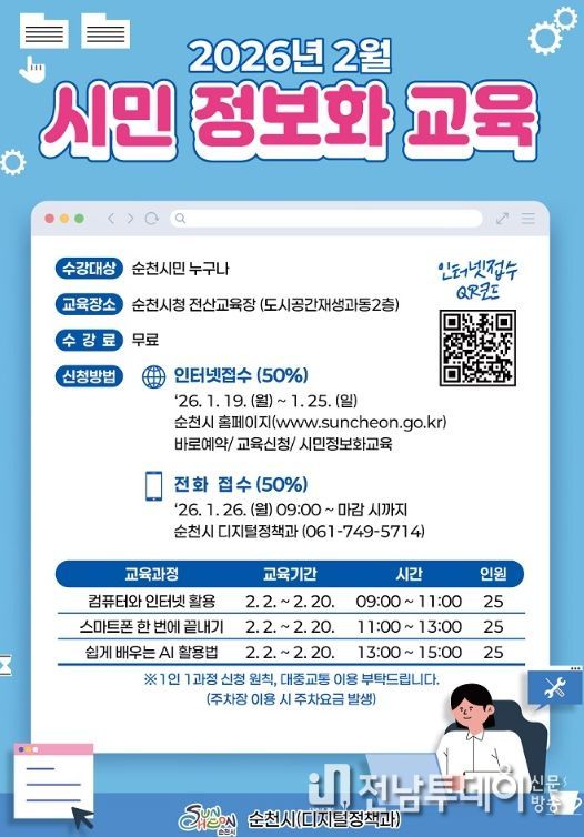 전남투데이 조평훈 기자 | 순천시는 디지털 기기 사용에 어려움을 느끼는 시민들이 일상생활에서 겪는 불편을 해소할 수 있도록 ‘2026년 정보화 교육’ 수강생을 오는 19일부터 모집한다고 밝혔다.