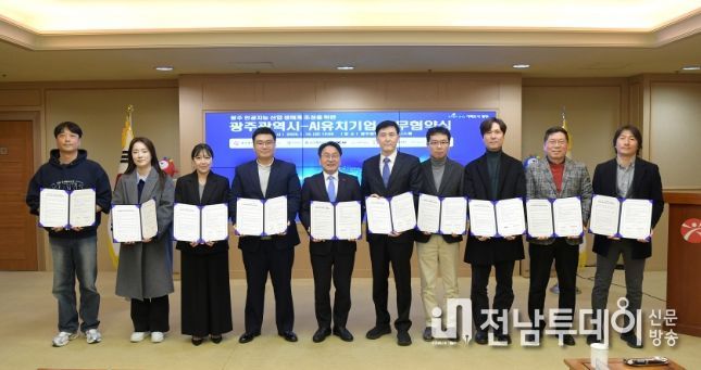 광주광역시는 16일 시청 비즈니스룸에서 제조·헬스케어 등 인공지능(AI) 전문기업 9개사와 ‘광주형 인공지능 비즈니스 업무협약’을 체결했다.