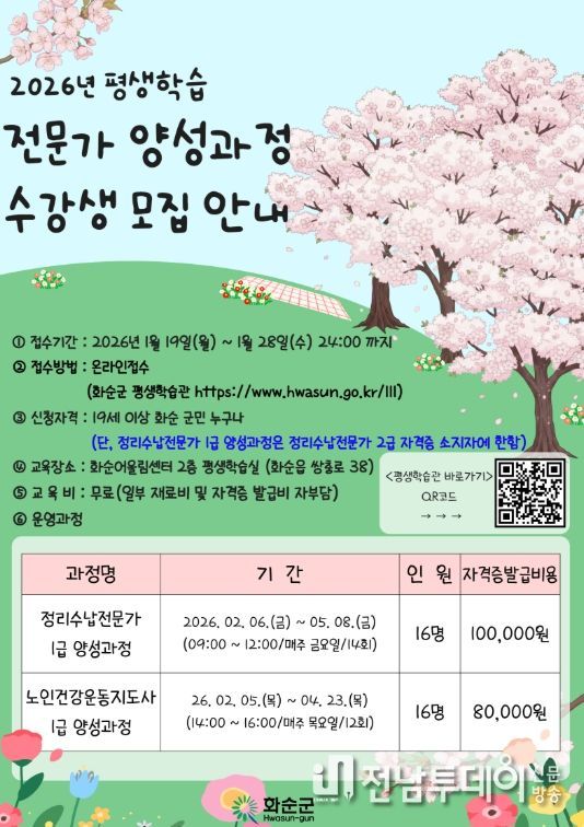 전남투데이 강영선 기자 | 화순군은 1월 19일부터 1월 28일까지 ‘2026년 상반기 평생학습 전문가 양성과정’ 수강생을 모집한다고 밝혔다.