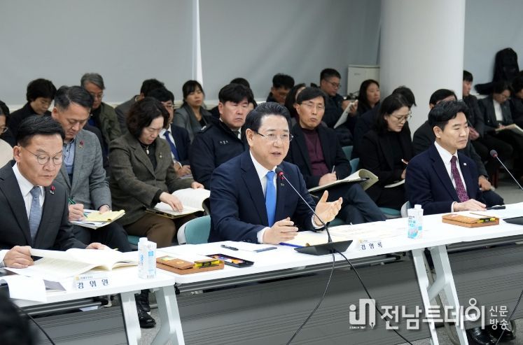 간담회엔 김영록 전남도지사와 김태균 전남도의회 의장, 김대중 전남도교육감, 광주·전남 행정통합 추진기획단장인 강위원 경제부지사, 전남도 실·국장, 도의원 등 100여 명이 참석했다.