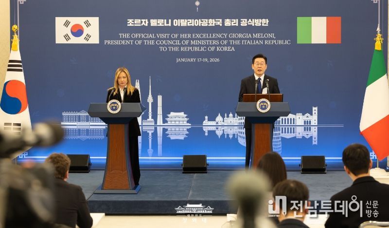 전남투데이 정홍균 기자 | 이재명 대통령은 19일 조르자 멜로니 이탈리아 총리와의 정상회담 뒤 "저와 멜로니 총리는 전략적 동반자 명칭에 부합하는 미래지향적 수준으로 양국 관계를 더욱 발전시켜 나가기로 합의했다"고 밝혔다.