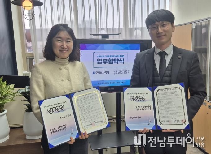 전남투데이 김경민 기자 | 광주광역시광산구시설관리공단 행복나루노인복지관은 1월 14일 주식회사 국제(대표 김정수)와 고령시민의 디지털 문화격차 해소 및 정보화 역량 강화를 위한 업무협약을 체결했다.