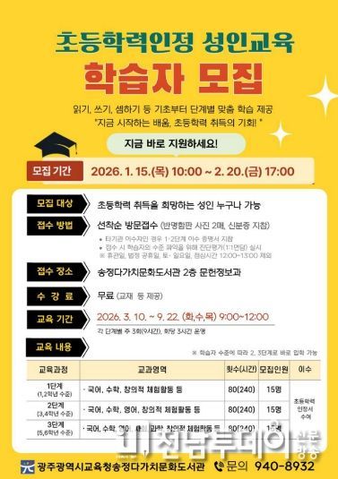 전남투데이 김경민 기자 | 광주시교육청송정다가치문화도서관은 ‘2026학년도 초등학력인정 성인교육’ 프로그램을 운영한다.