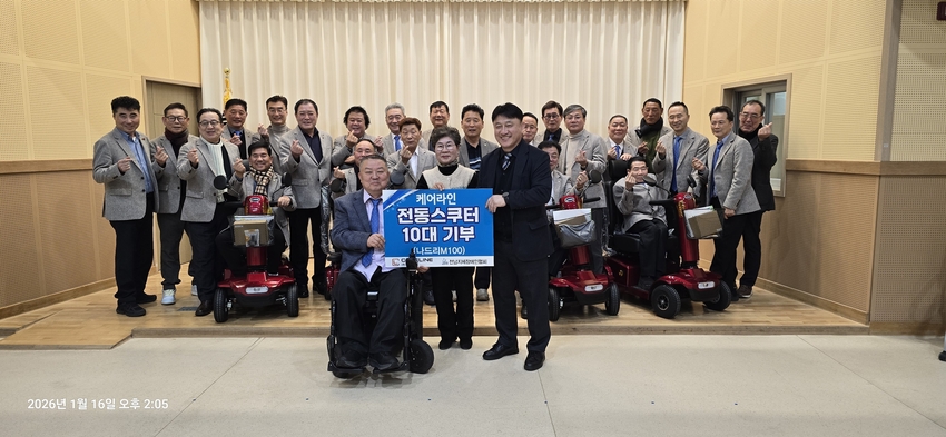 이번 전달식은 주식회사 케어라인이 장애인의 이동권 보장과 일상 자립 지원을 위한 사회공헌 활동의 일환으로 2026년 신모델 ‘나드리 M-100’ 전동스쿠터 10대를 전남지체장애인협회에 후원하며 마련됐다.